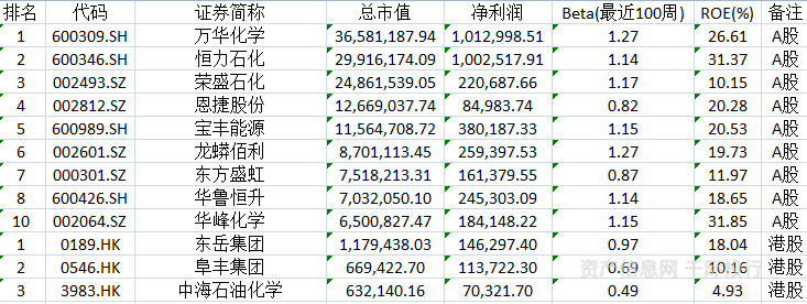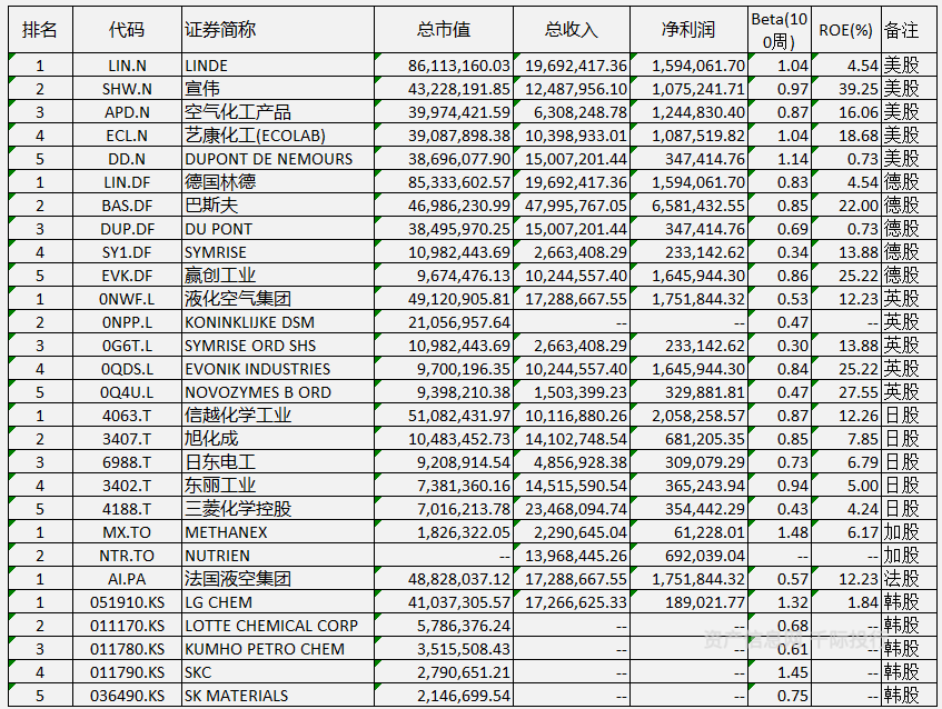 1)万华化学(109.790, -4.53, -3.96%)[600309.SH]:决方案。公司业务涵盖MDI、TDI、聚醚多元醇等聚氨酯产业集群,丙烯酸及酯、环氧丙烷等石化产业集群,水性PUD、PA乳液、TPU、ADI系列等功能化学品及材料产业集群。所服务的行业主要包括:生活家居、运动休闲、汽车交通、建筑工业和电子电器等。在生产领域,国内烟台、宁波、珠海等地生产基地稳定运营。在研发领域,烟台、北京、佛山、上海等地的研发中心已逐渐成型,北美技术中心在休斯敦正式投入使用。另外,万华化学在欧洲、美国、日本等多个国家和地区均设有公司和办事处。