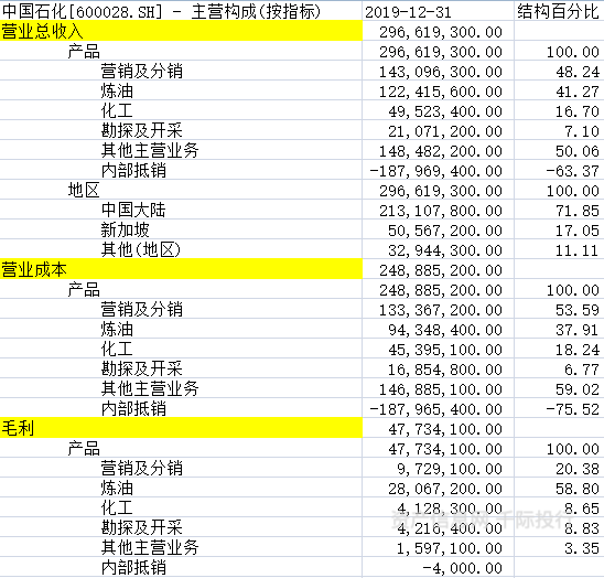 表中国石化(4.500, 0.05, 1.12%)为例分析主营结构