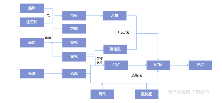 图 PVC电石法和乙烯法生产流程