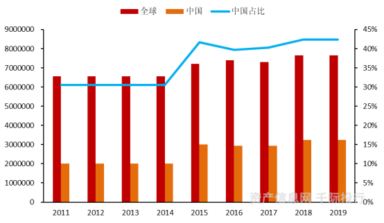 图2011年-2019年钛白粉全球产能与中国产能(单位:公吨)